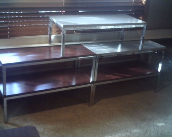 have 5 heavy duty stainless steel framed wood top gray or brown tv stands, coffee tables or display tables, 2,5ft long x 1.5 ft wide x 1ft tall. $99 each x 5, can buy 1 or all