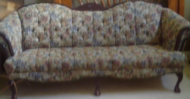 sofa, multicolored victorian, like new condition. antique, paw wood feet, wood crown, wood arms. burgundy, blue, olive green pretty floral print.