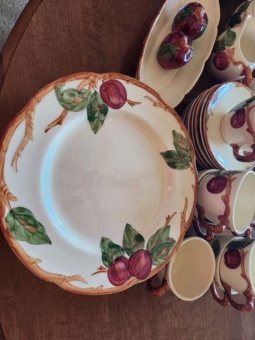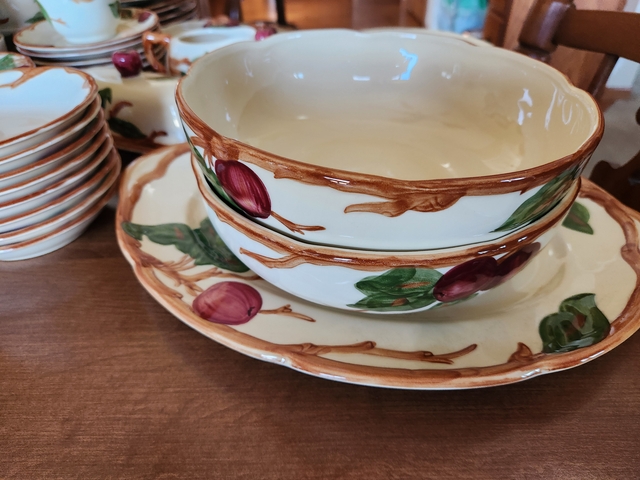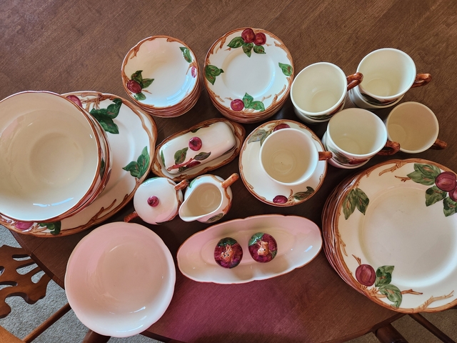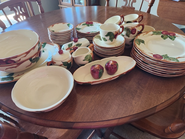 8- dinner plates, 8- salad plates, 8- saucers, 8- cups, 8- cereal bowls, 1- large 14" oval serving platter, 1- oblong relish dish, 2- large serving bowls, 1- medium serving bowl, 1- sugar bowl with lid, 1- creamer, 1- salt & pepper set, 1- covered butter dish. (49 pcs. total)