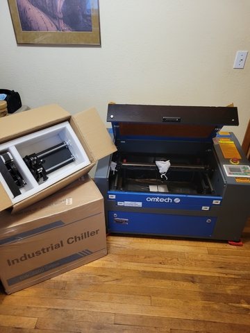 Omtech laser engraver, SH G350 50w 110v exterior packaging remove, Accessories still wrapped.