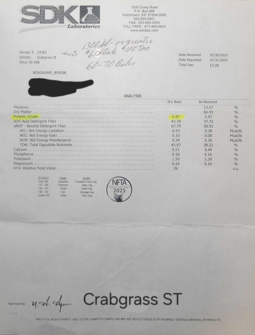 60 -70 5x6 Round Bales of Crabgrass. Hay is fine stem, green, never rained on and fertilized. John Deere 569 Netwrap Baler. $60 a bale, hay is located by Waterloo, KS (316) 444-2598 Calls Only
