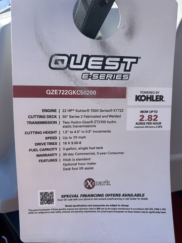 Need to make quick work mowing your lawn? Quest E-Series zero-turn lawn mowers deliver professional performance and power at the tip of your fingers. The residential zero-turn mower allows homeowners to mow up to 2.8 acres per hour, moving up to 7 mph. Add Exmark's zero-turn maneuverability, and it adds up to a premium residential mower at an affordable price. Ride in style and comfort on the E-Series mower's floating decks and ergonomically designed seat system. Every Quest comes with commercial-grade wheels to instill confidence in the riding mower's ability to deliver precise cutting and professional-grade traction for zero-turn riding. This mower is priced to sell, message us today! Financing available.