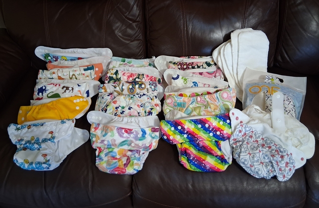 Six LBB brand cloth diapersSix Baby Goal brand cloth diapersSix Alva Baby brand cloth diapers with 6 additional inserts.One Grovia brand cloth diaperOne Fuzzi Bunz cloth diaper