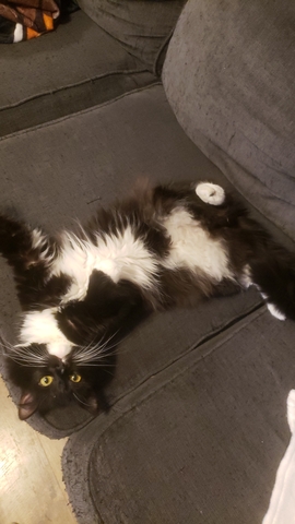 This is Little Foot, neutered, 3 year old, tuxedo mink ragdoll. He was born without a paw on his left back leg, but it doesn't bother him. He is very cuddly as ragdolls are!! Need to rehome due to my cat allergy.