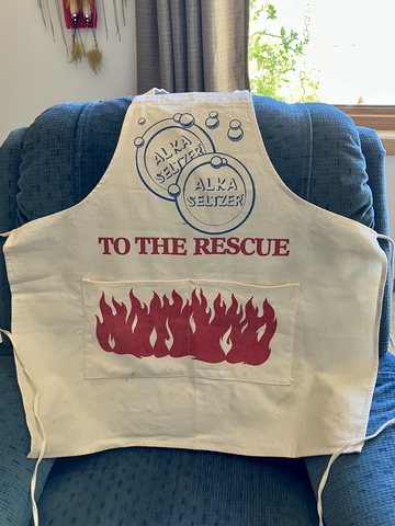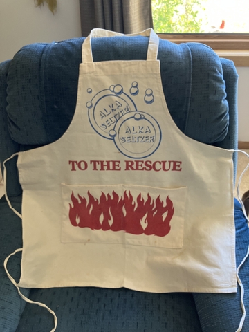 This apron advertises Alka Seltzer. It's old and has a few stains from being in storage. It'd be good fun for a chef or for someone who collects old merchandise advertising items.