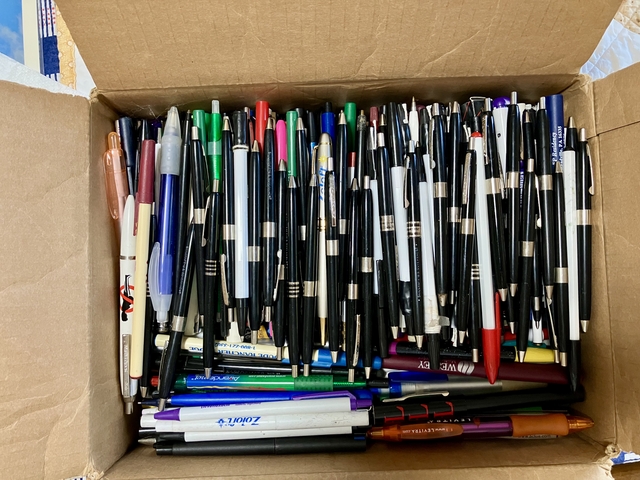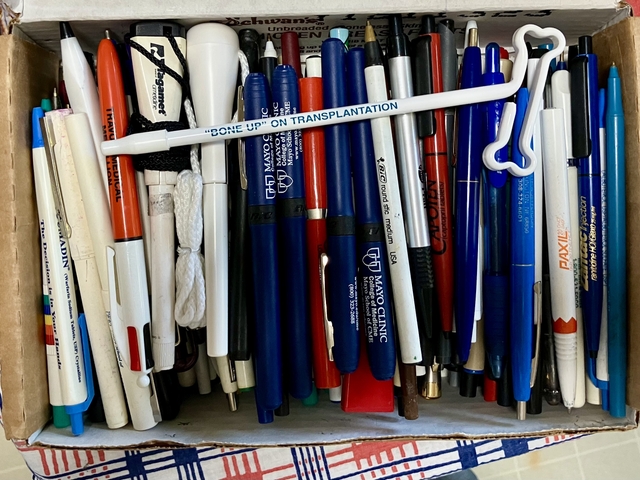 These pens and pencils have been collected over about 50+ years. Many advertise prescription drugs because they were picked up at medical conferences. There are other advertisements, too. I can't guarantee that they are all in working order! This would be good for someone collecting old merchandise advertising items as well as a pen or pencil collector. There are fewer pencils than pens. I'd like $20 for all 3 boxes.