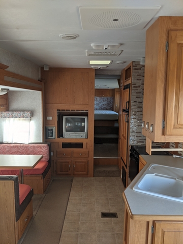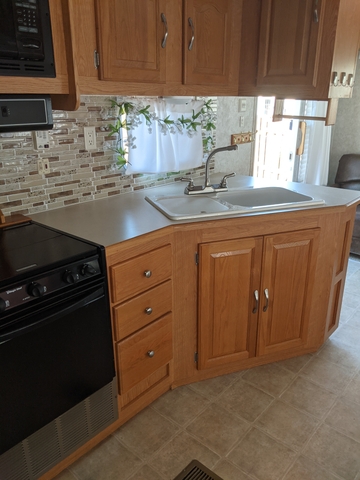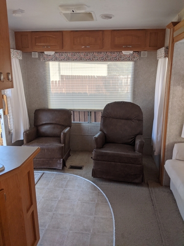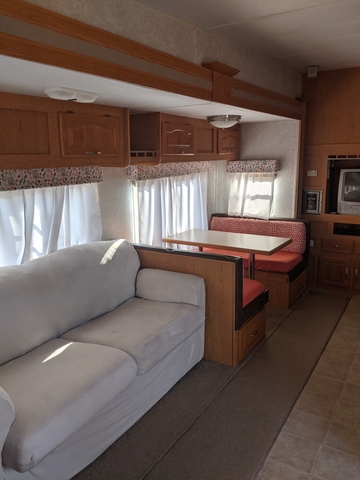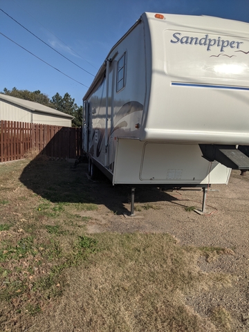 Welcome to your home away from home while enjoying your camping fun in this beautiful, updated 2004 Forest River Sandpiper 27RLSS. This 5th wheel has been well taken care of and has been updated throughout. A front door handle has been added for convenience with a screen protector added for protection from those little ones and fur babies. The 2 leather chairs (one a recliner and the other a comfortable rocker) and hide a bed sofa in the slide allows plenty of conversation area. The sofa was modernized with a soft, stretchy cover. Moving into the kitchen the booth seats have bright and cheery covers that match the updated valances and curtains. The area can be made into a nice little bed. Peel and stick tile was added to give a homey feel on the kitchen backsplash. It has an excellent microwave, 4 burner stove with an oven. The refrigerator can run on either propane or electric. And the faucet was updated to bring that modern feeling into the kitchen. The split bathroom has a pretty little shower curtain and the peel and stick wallpaper gives it a modern feel. The bedroom is equipped with a lift kit for the queen size bed. There are two closets on either side of the bed and a full closet with 3 drawers leading into the bedroom. This camper has a hot/cold outside shower, electric front jacks, an Onan 2500 generator, 2 propane tanks, and the back bumper holds the sewer hose. It also has a hitch and connection harness. One side of the camper does have a sunburn, but it's been kept washed and waxed. The other side is still beautiful. Both the awnings (slide topper and patio) were replaced in 2025. New tires and wheel bearings were done in spring of 2025. Salina RV rebuilt and reskinned the back panel in the spring of 2024 due to a leak at the corner of the roof. They fixed that problem and they found no more leaks. All owner manuals are organized and readily available to answer any questions on the components of this camper. All in all this has been a terrific camper to go to the lake.