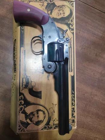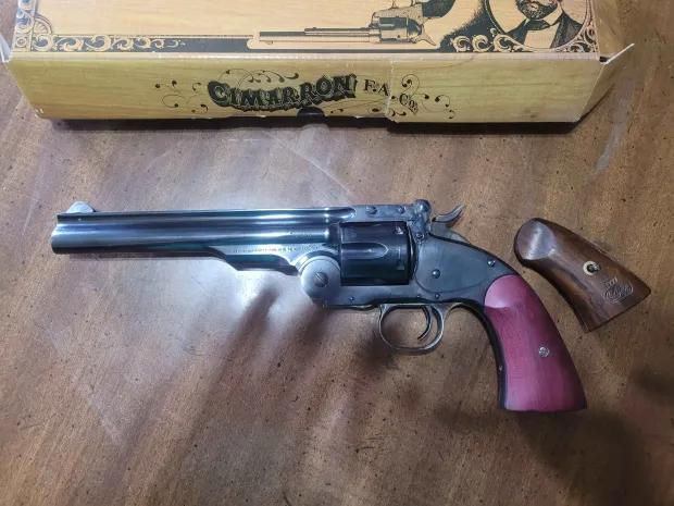 A cimarron model three schofield in 45colt. like new. custom made purple heart grips. less than 200 rounds have been shot. origional grips included.you can text at 785- three 2 two- seven 1 0 one