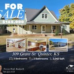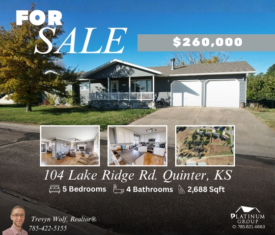 This 5-bedroom, 4-bath home in Quinter offers a comfortable layout with 2,688 finished sq ft and a functional feel from top to bottom. Built in 1986, it includes a primary bedroom suite with a spacious walk-in closet and bathroom. The main level features an appealing floorplan with good flow that features an updated kitchen and a large 10 x 25 sun room. Moving to the walk out basement, you will find two additional non conforming bedrooms along with additional living space and plenty of storage options. The backyard is nicely laid out with a small shed, a garden area, and a raised deck that overlooks the yard. The property also comes with an additional 3.66-acre lot directly behind the home, giving you plenty of open space for projects, recreation, or just enjoying the extra yard. To schedule your showing today, call Trevyn Wolf at 785.422.5155.