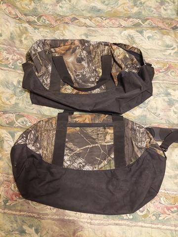 Listing a pair of heavy canvas 24-inch camo duffle bags from Wel-Bilt. Both have shoulder straps and one front zipper pocket. No holes, rips or damage, and all the zippers work. All handle seams sturdy and pristine. I used these to store hunting clothes for a couple of seasons and am switching to a new system.