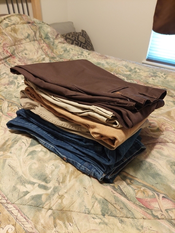 Selling six pairs of men's pants with 34 waist and varying lenths. The first four were for weddings/special occasions and only worn once, and now they're a bit tight because we love carbs in this house. The 13MWZs were worn as "going out" jeans for a few months.