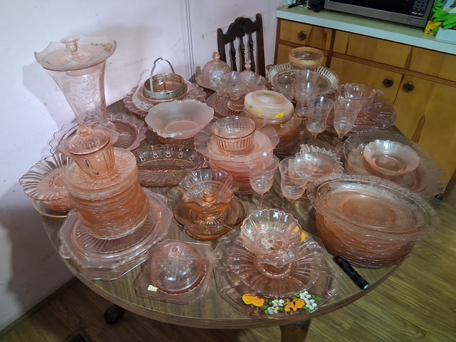 Here is some vintage Pink Depression glass dishes.What is in the pictures is all that I have.I would like to sell everything together.But might sell individual pieces if the price is right.The exception is I have a sandwhich plate and 8 plates not pictured at the moment.Cash Only. May accept a reasonable best offer?