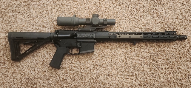 Like new. Aero M4E1 upper and lower. Atlas s-one 15 inch handguard. 16in Ballistic advantage 1/7 twist 5.56 barrel. Strike industries extended charging handle. Angstaad Arms BCG. Aero lower parts kits. Cerakoted Vortex strike eagle 1-6x scope.