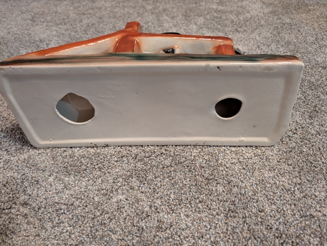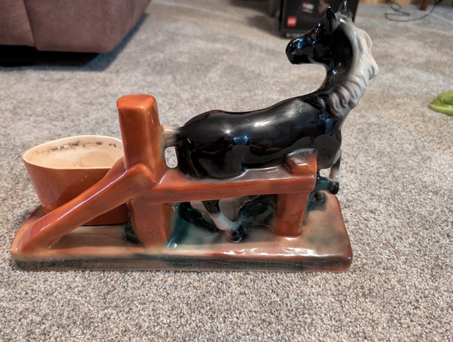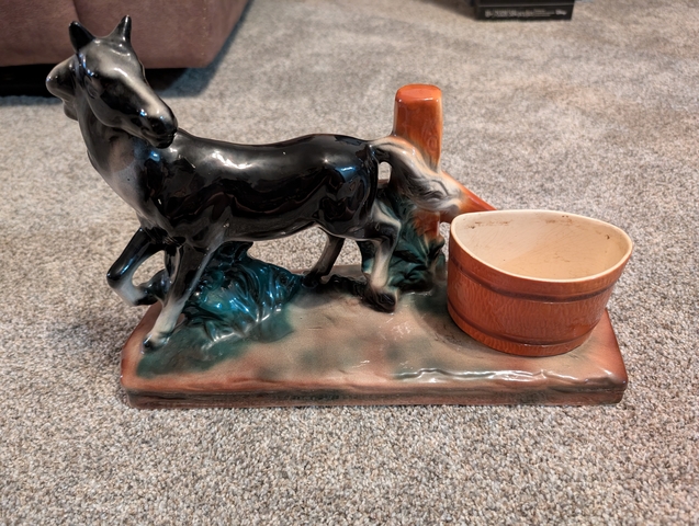 Antique ceramic black horse by water trough planter