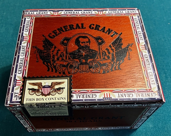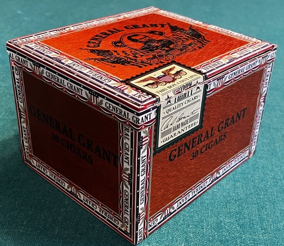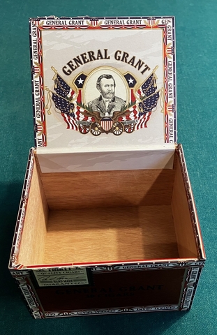General Grant, empty wood cigar box with applied paper decoration. Approx. 5.5”x4.5”x3.5” high.