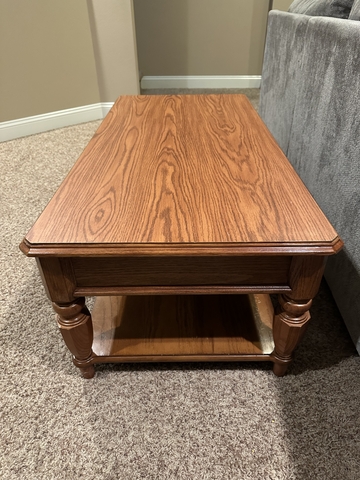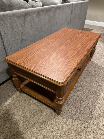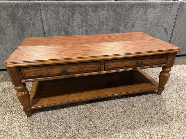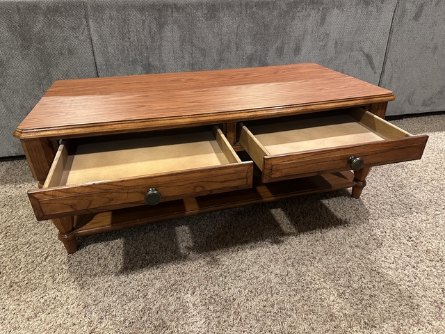 Oak coffee table with 2 drawers, in great condition. From a smoke-free home. Measurements: 48"L x 24"W x 18 1/4H.
