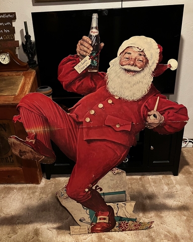 This is an original advertising Pepsi Santa. Cardboard, stand up. Has is intact/complete. He's holding a 'swirl' pepsi bottle which dates to 1958. Desended from Norman Rockwell's art. He's pretty rare, 48" tall to the top of the bottle.He's 66 years old and still lookin' pretty good.