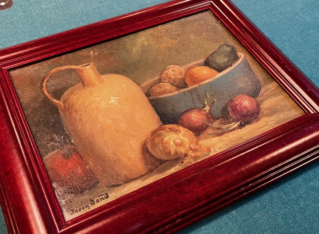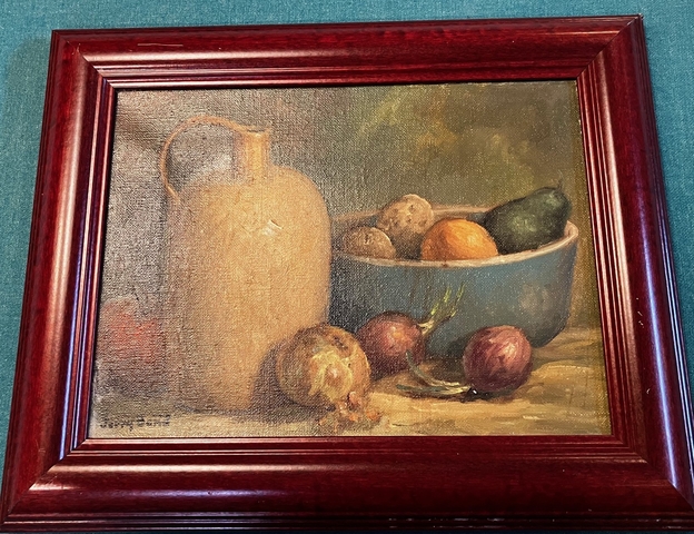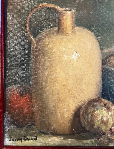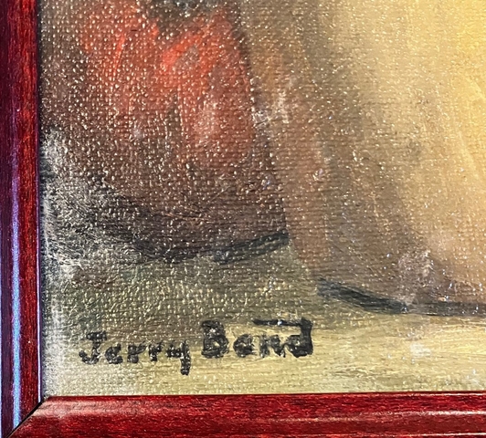 Oil painting on board by Jerry Bond. From online information, Bond was a 20th century artist based on the west coast. His work can be seen online. Nicely framed, measures 15.5"x a little over 11". Image area measures 11.5"x8.5".