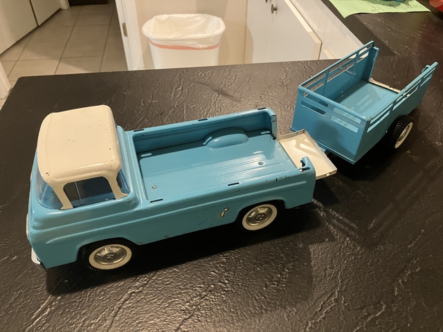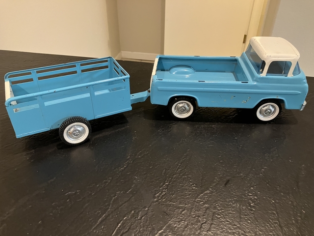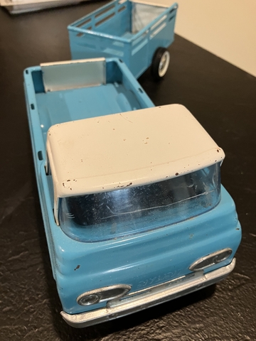 Nylint farm truck and trailer. Ford Econoline in good shape for its age. 1960s? Bought for grandkids to play with and they are done with them.