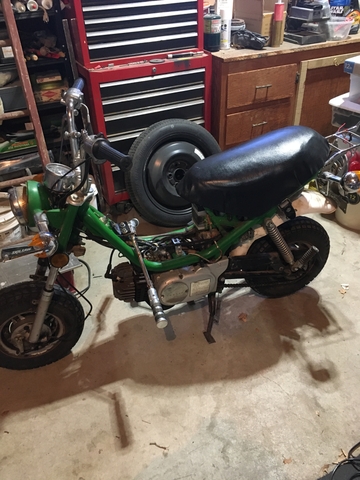1977 Yamaha Chappy. 80cc engine, automatic transmission has sat for about 2 years. Needs restoration. Not currently running but was running prior to storage. I have the original footpegs and the covers (not pictured). Great little bike and fun to ride. No title. Bill of sale. $350.00 obo. No trades. Contact through this site.