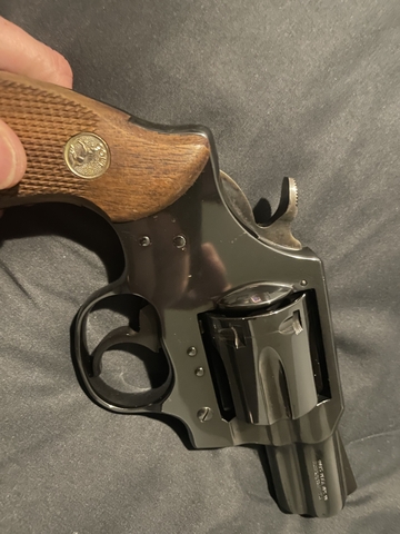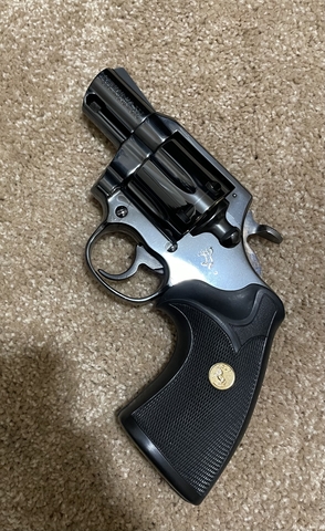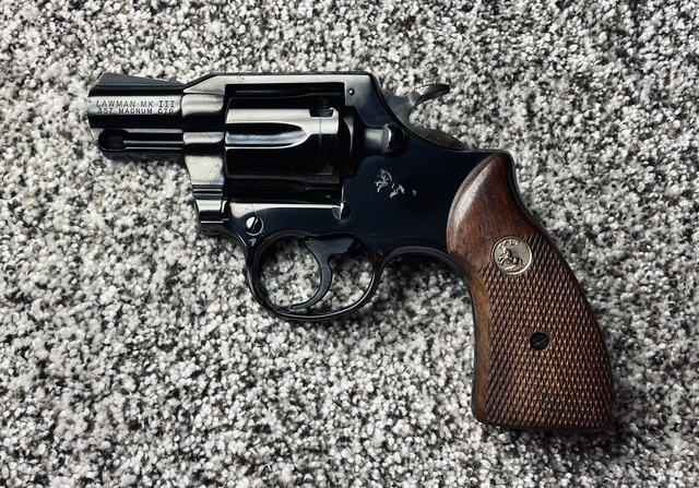.357 magnum snub nose 2 Inch barrel 1984 Colt Lawman Mkiii. Really nice pistol. Small scratch by the horse and one small scratch on the back. Wood and rubber grips.