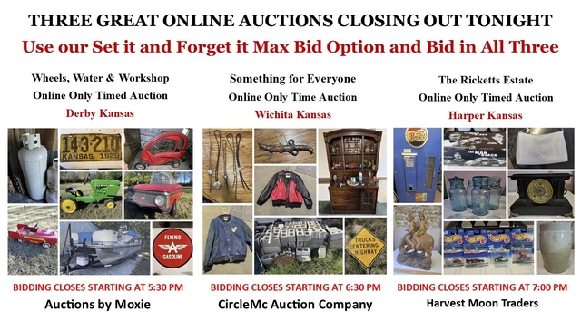(3) Three Online Auctions CLOSING OUT Tonight on Platrom and not a single reserve in the house. Everything Sells to the Highest Bidder with NO Reserve and NO Sales Tax. It's gonna be a Three-for-Thursday kind of night with (3) Three Great Online Timed Auctions CLOSING OUT on Platform. 1st up starting at 5:30pm is the Wheels, Water, and Workshop Auction out of Derby Kansas. In it we have a pontoon boat, antique pedal car collection, tools, and more. Next up, starting at 6:30pm is the Something for Everyone out of Wichita Kansas and it say's what it means and means what it says. There is a little bit of everything for everybody in this one. Last but not least starting at 7:00pm is The Ricketts Estate out of Harper Kansas which also offers up a nice selection of antiques, collectibles and useful everyday items. The best part is, there is not a single reserve on platform tonight. Everything sells to the highest bidder with NO Reserve and NO Sales Tax so get your bids in before it's too late. Bid Now!