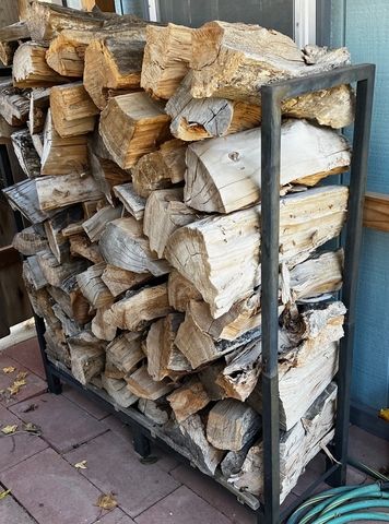 Cut and Split, about 4' high x 4' wide. 18" or so deep. Assortted hard and soft wood. Pickup only. My back and knees don't work like they used to. Does not include the rack.