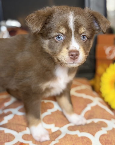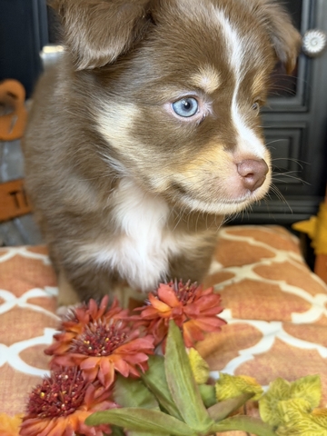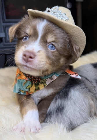 Beth is our last available Toy Aussie from this litter a beautiful tri-colored red blue eyed female with the sweetest personality. She loves people, is super social, and has been handled daily so she’s well-adjusted and confident.