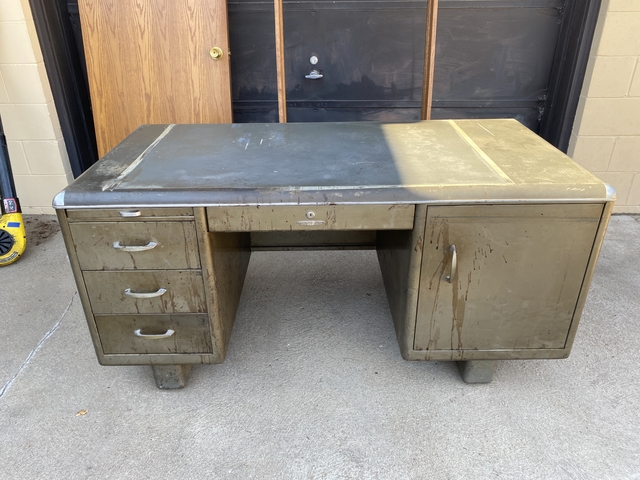 The other desk has 3 drawers on the left side with a slide out shelf, middle pencil drawer, and a cabinet on the right with a shelf that lifts out and up.
