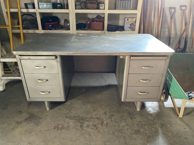One of the desks has 6 drawers total (3 on each side) and a slide out shelf on both sides.