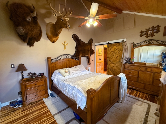 Step into the owner’s suite, where a tongue-and-groove pine ceiling and thoughtfully designed finishes create the ambiance of a secluded cabin retreat. The adjoining private half bath continues this peaceful aesthetic, showcasing a custom mountain-pine double-sink vanity and a walk-in shower. A beautifully updated full bath with a granite vanity serves the additional main-floor bedrooms.