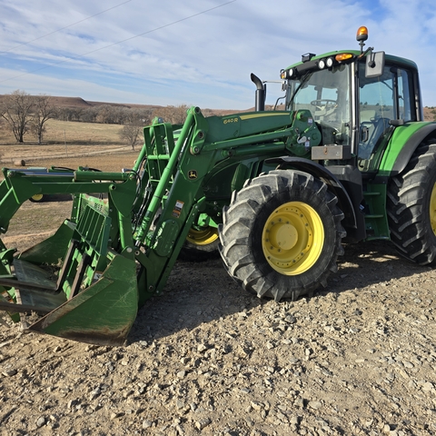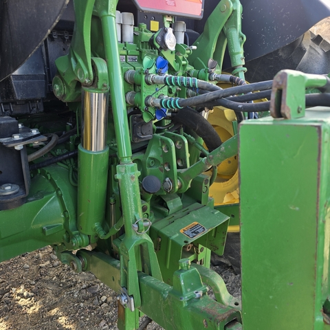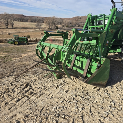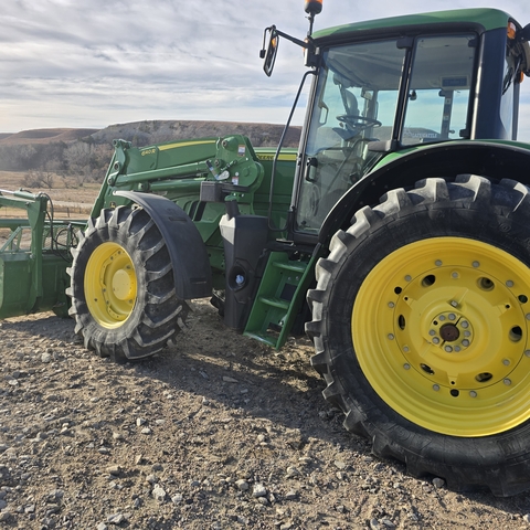 2017 John Deere 6145M. 640R loader with bucket and grapple. Also includes bale spear, pallet forks, and 3-way hydraulic rear blade.