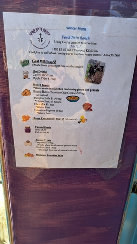 Come check out our Icebox / Farmstand! We offer hot coffee and cider with fresh baked goods, caramels, goatmilk soaps, canned goods, and produce. We are restocking and adding new items throughout the week. You are welcome to say hi to our goats while you are here. Facebook: Ford Twin Ranch or call 6204307890 if you want to schedule a time to meet the other critters.