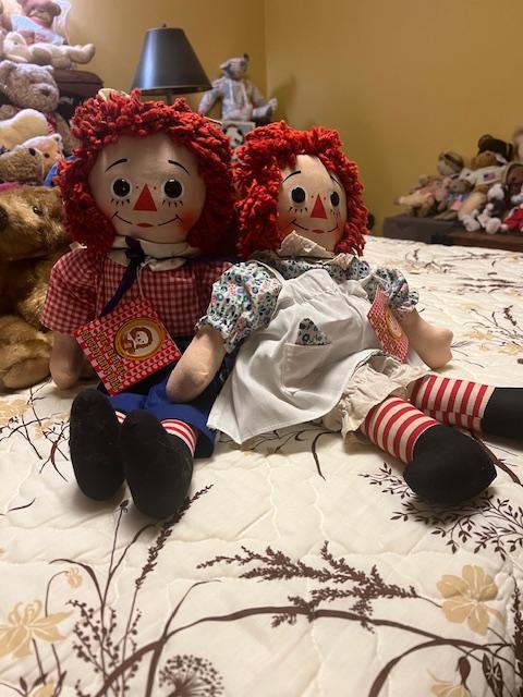 The Cheer Bear is large- about 18 inches. The other stuffed animal are 12 inches. Ragged Ann and Andy are 12-15 inches and will be sold as a set.