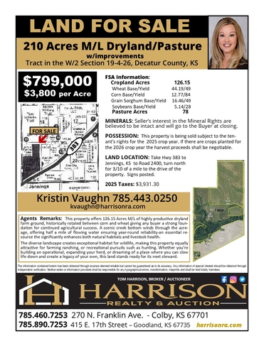 The diverse landscape creates exceptional habitat for wildlife, making this property equally attractive for farming ranching, or recreational pursuits such as hunting. Whether you’re building an operational, expanding your herd, or dreaming of a place where you can slow life down and create a legacy of your own, this land stands ready for its next steward. Contact Kristin at 785.443.0250 or 785.460.7253 to view this property!