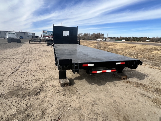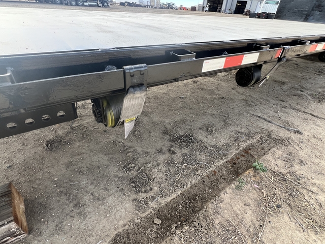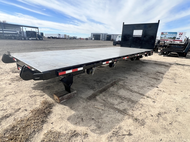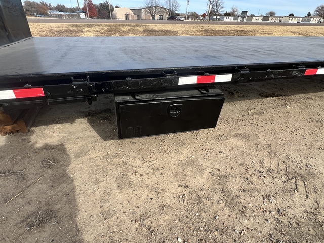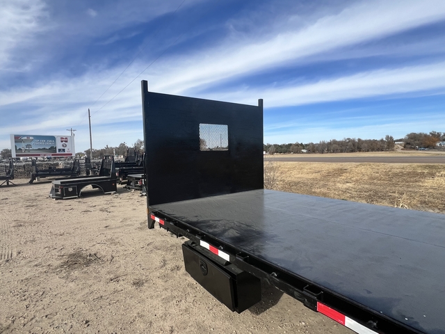 24" x 102" - 34" frame rails, Flatbed with headache rack, 1 tool box, and 6 sliding winches
