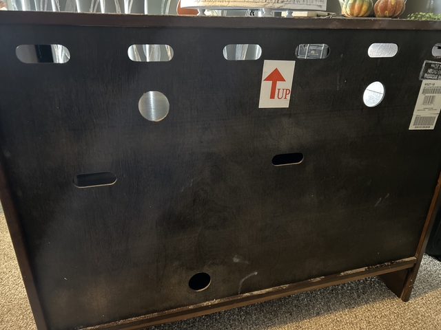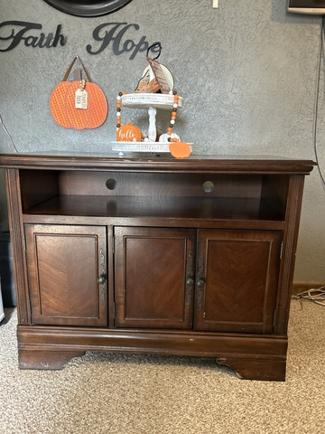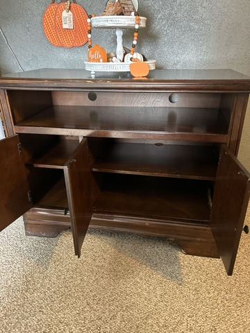 Cherry wood cabinet originally purchased from Ashley furniture. Multiple shelves, easy access through back for cables and wires. Good condition, very heavy. First $30 cash owns it. I can help load. Can call or text 785-62three-800four.