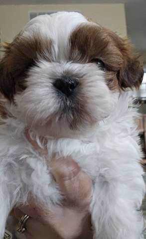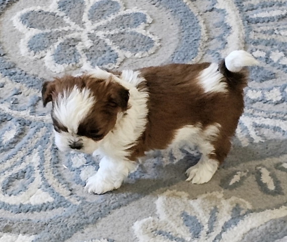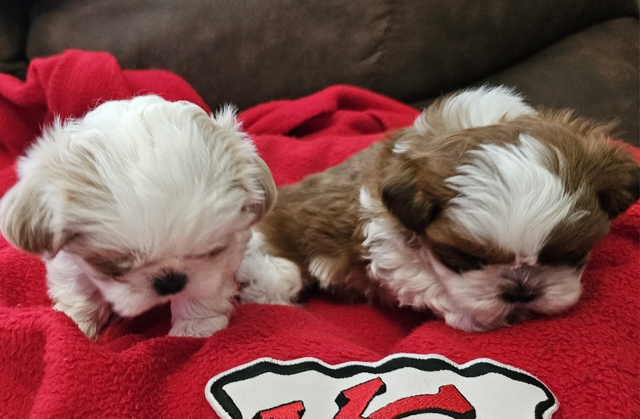 ***Updated***APRI registered Shih Tzu puppies with three generation pedigree. 1 female (white/ cream)-SOLD, 1 male (brown/ white) . Born October 5th, will be ready December 8th. Shots will be current, deworming current, dew claws removed, and micro-chipped. Fun, loving, very playful.