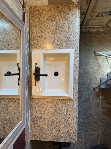 Countertop is cut for this sink. Counter is 61" long x 22-3/8 deep. Sink is Mansfield brand. 22-1/4 long x 18-5/8. Faucet is Moen brand. Text 620-451-1104