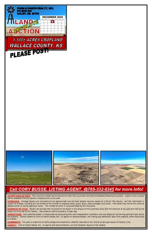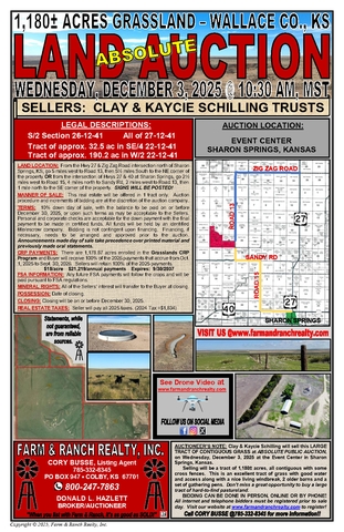 AUCTIONEER’S NOTE: Clay & Kaycie Schilling will sell this LARGE TRACT OF CONTIGUOUS GRASS at ABSOLUTE PUBLIC AUCTION, on Wednesday, December 3, 2025 at the Event Center in Sharon Springs, Kansas.