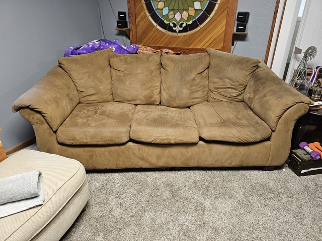 Good couch. No rips or tears in the fabric, springs are still good. Measures 7' 3" long, 3' deep, 34" tall. Pet and smoke free home.