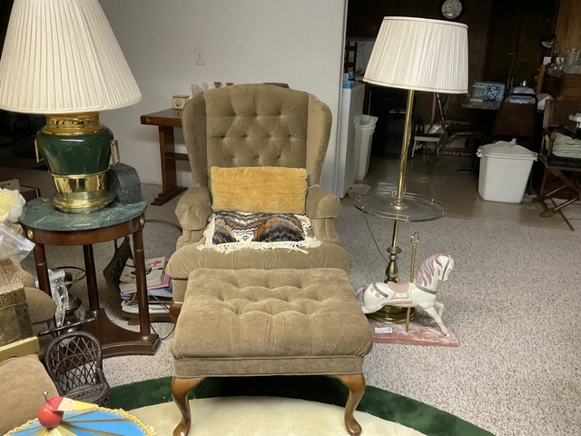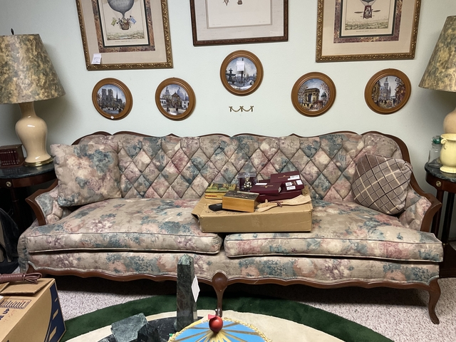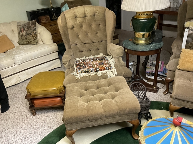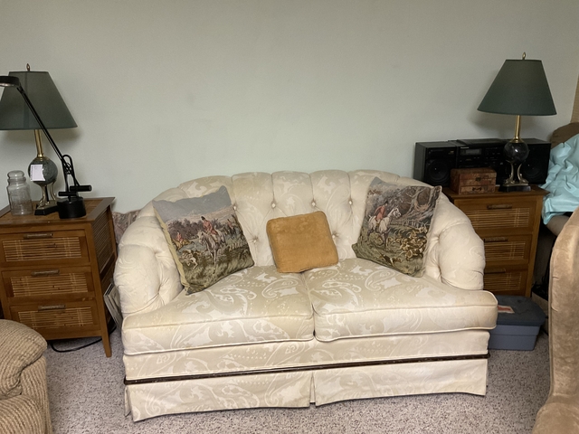 Full size sofa in mauve tones, cream colored love seat and wing chairs/ ottomans. Non smoking home.