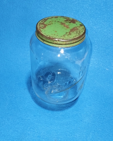HAS LID BUT NOT ORIGINAL ALTHOUGH IT IS ALSO AN ANTIQUE. ORIGINAL ANTIQUE CRYSTAL NO. 3 JAR. NO CATCH CUP.