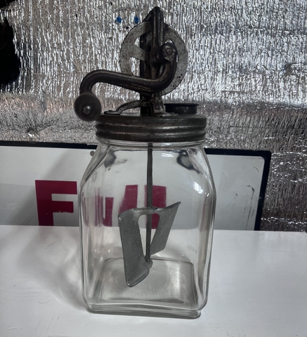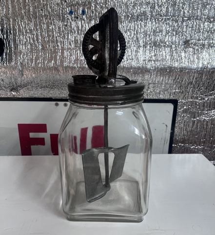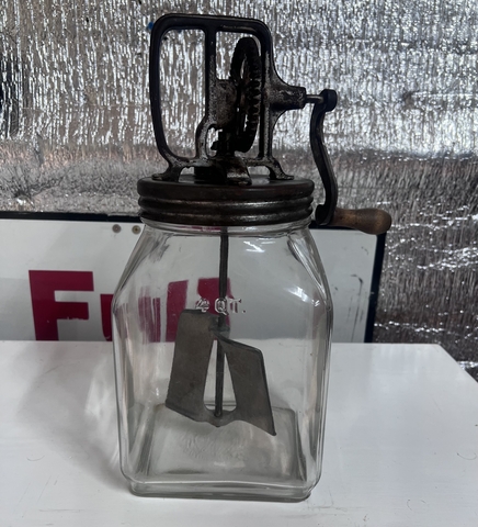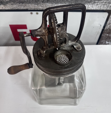 Have an Antique 4 Qt Square Glass Butter Churn with screw-on hand crank. Glass has no chips or cracks, and hand crank is fully functional. On crank assembly there is a V 83 on it, and 4 Qt on the glass itself. (NO HOLDS)(No Deliveries)(CASH ONLY) LOCATED IN HAYS, KS