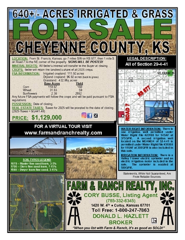 Located southwest of St. Francis, Kansas, this property can be accessed by traveling 7 miles southwest on RS 877, then 1 mile south on Road 7 to the northeast corner of the property, where signs will be posted. All of the Seller's mineral rights will transfer to the Buyer at closing. The Seller will retain the landlord's share of all 2025 crops. According to FSA information, the property includes 111.02 acres of irrigated cropland, 96.92 acres of dryland cropland currently transitioning back to grass, and approximately 432.06 acres of grassland. Base acres consist of 110.87 acres of corn with a 180-bushel yield, 31.83 acres of wheat with a 59-bushel yield, and 2.38 acres of sunflowers with a 2,652-pound yield. All future FSA program payments will follow the crops and be paid in accordance with FSA regulations. Possession will transfer to the Buyer at closing. Real estate taxes for 2025 will be prorated to the date of closing (2025 taxes: $3,441.40).