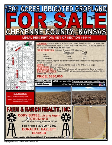 Located southeast of St. Francis, Kansas, this property is accessed by traveling 3 miles southwest on RS 877, then 71/2 miles south on Road 11, 1 mile east on Road E, and 1 mile south on Road 12 to reach the northeast corner. Signs will be posted for easy identification. FSA information will be provided when available, and all future FSA program payments will follow the crops in accordance with FSA regulations. The buyer will receive the landlord's share of the 2026 wheat crop. Possession will be granted at closing. All of the seller's mineral rights will transfer to the buyer at closing. Real estate taxes for 2025 will be prorated to the date of closing (2025 taxes: $2,124.48).
