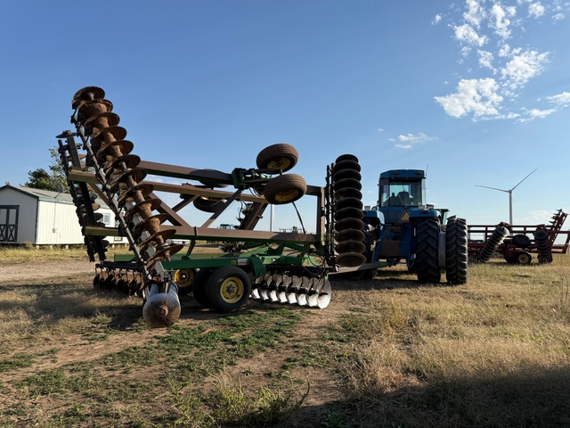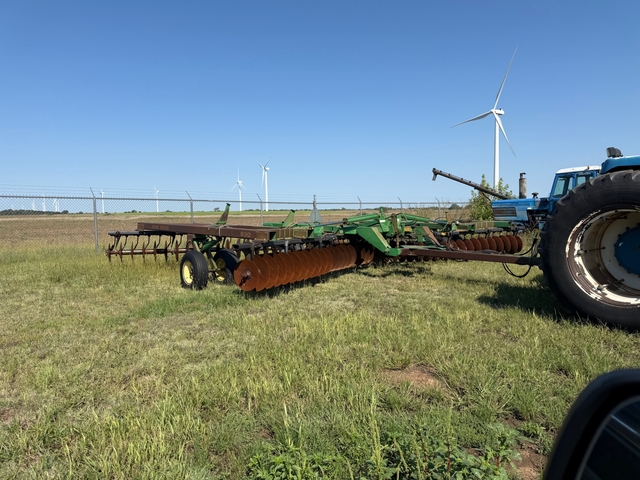 30 foot JD disc for sale. Gang bearings were all replaced about 7 years ago and are greasable. Tires are decent. It needs 3 scrapers. Just used it to go over 650 acres before we planted wheat in October. Call Henry at 620-886-1605.
