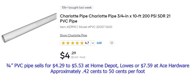 18 pieces ¾ x 10’ PVC Pipe - $30.00 ¾” Jet stream 200 PSI PVC plain end pipe. Over 200 feet of pipe for only $30.00. 12 pieces are 10-12’ long. 6 pieces are 12’ to 14’ long. 210 feet of pipe @ .42 cents per foot equals $88.00. At $30.00 – less than half price.