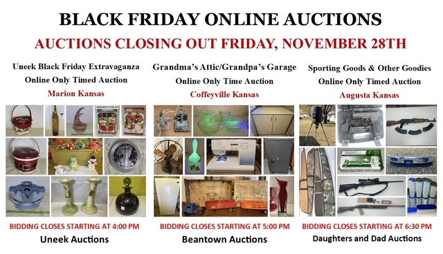 ONE of THREE Online Auctions closing out here on Black Friday. This one is the Uneek Black Friday Auction Extravaganza out of Marion Kansas. This auction is offering up 773 lots of collectibles including coins, jewelry, Longaberger, sports cards, autographs, pottery, art glass, Beanie Babies along with other assorted antiques and collectibles. Everything sells to the highest bidder with NO Reserve and NO Sales Tax plus fast & affordable in-house shipping is available. HURRY and get your bids in before it's too late. Online bidding starts closing out at 4:00pm today.