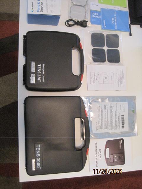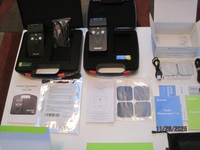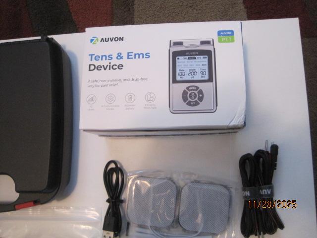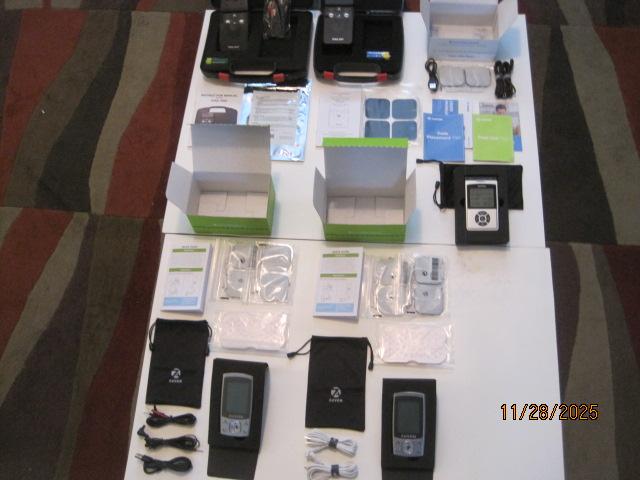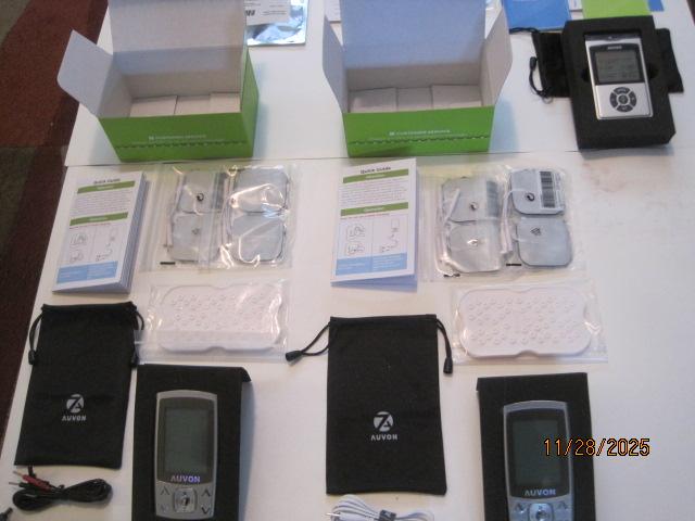 An assortment of TENS and EMS units which were purchased in a bulk lot on ebay for my wifes car accident pain. We have kept one for her and one for me that I use for neuropathic pain in my feet. They do help both of us with our pain, and these are the extras that are not needed. They come with unopened new pads, charging cables, and instruction booklets. The two upper units in the black cases operate on a 9v battery. The other three Auvon units charge via USB. All new units have been tested and put back in their boxes. A good deal for these without needing a physician visit or prescription. $20.00 ea.